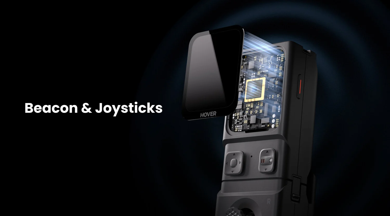 Lorsque Beacon est connecté à un joystick, le système se transforme en une manette de détection de mouvements à une main, permettant de guider la caméra volante grâce à des commandes intuitives basées sur l’inclinaison et un seul joystick.